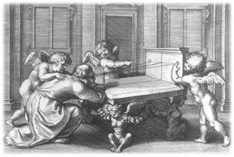 François de Aguilon. Opticorum libri sex philosophis juxta ac mathemacticis utiles. Antverp: Ex officina Plantiniana, apud Viduam et filios J. Moreti, 1613. (Page 195) Χαλκογραφία. This engraving of putti demonstrating the “horopter” is from Opticorum libri sex (Six Books of Optics) by François de Aguilon. The illustrations throughout the book are by the great Flemish Baroque painter, Peter Paul Rubens (1577-1640).